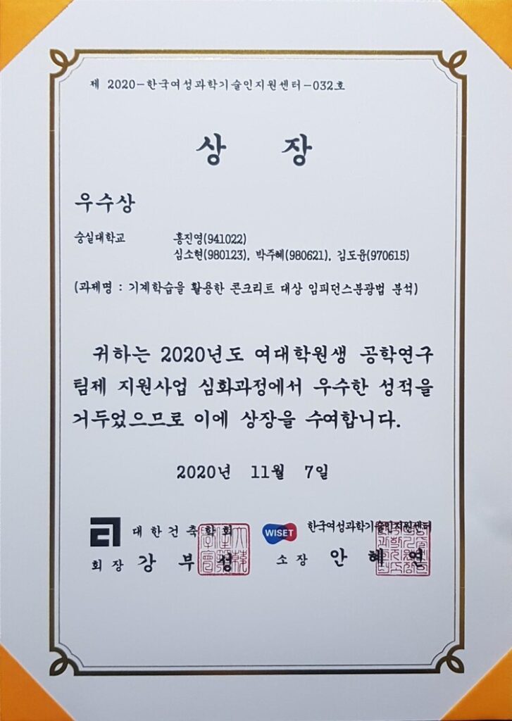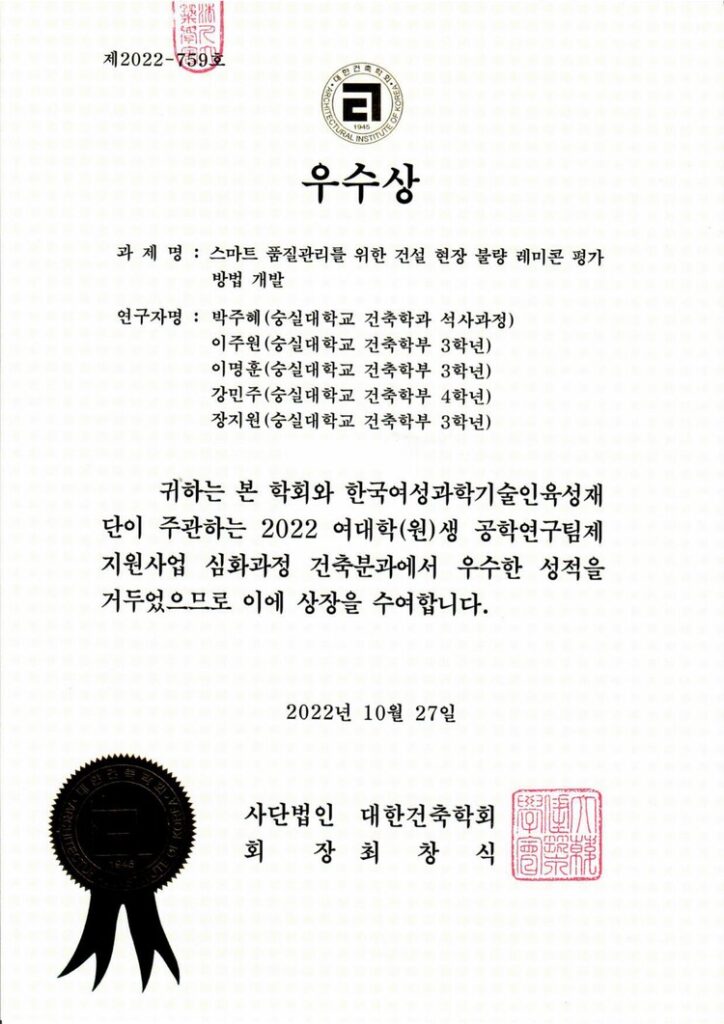 ACTIVITY GALLERY 비파괴 연구실 비파괴 연구실의 활동을 소개합니다! [Oct. 2022] 22년도 여대학원생 공학연구팀제 지원사업 결과 2023-02-28 [Oct. 2022] 22년도 대한건축학회 추계학술발표대회 우수발표논문상 수상 2023-02-28 [Oct. 2022] 중소벤처기업부 장관 표창 수상 2023-02-07 [Nov. 2022] 2022년 한국콘크리트학회 가을 학술대회 참가 2023-02-07 [Oct. 2022] 2022년 대한건축학회 추계학술발표대회 참가 2023-02-07 [May. 2022] 2022년 한국콘크리트학회 봄학술대회 참가 2023-02-07 [Nov.2021] 2021년 한국콘크리트학회 가을 학술대회 참가 2023-02-07 [Nov. 2020] 2020년 여대학원생 공학연구팀제 지원사업 심화과정 결과 발표 2020-12-31 [Nov. 2020] 한국콘크리트학회 학술대회 참가 2020-11-09 [May. 2019] John S Popovics 숭실대학교 세미나 개최 2019-09-15 [1학기.2019] 열린수업 진행(건축재료 및 실습) 2019-08-12 홍진영 연구원 다수의 상 수상 2019-08-08 Previous Page1 Page2 Page3 Page4 Next